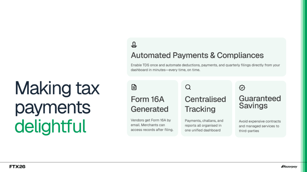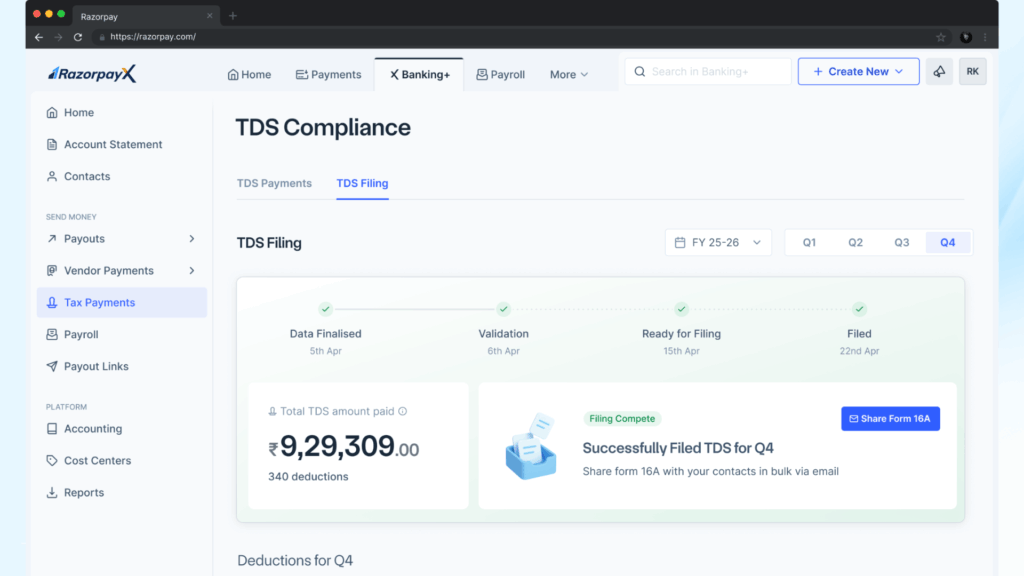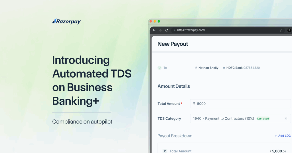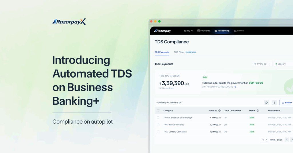 Automated TDS payouts and filing are now available as an add-on for all existing RazorpayX Business Banking+ customers. If you’re new to RazorpayX, sign up here to get started.